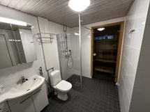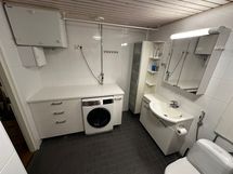 - Suihku, Suihkuseinä, Pesukonevalmius, Allaskaappi, Peilikaappi, Rättipatteri, Laattalattia, Laattaseinä, Lattialämmitys. Pesukoneelle paikka kodinhoitokalusteessa.