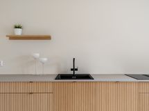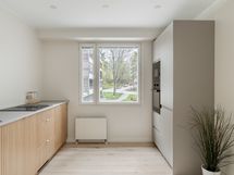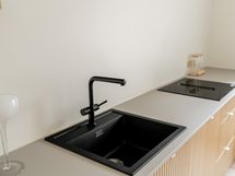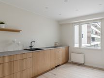 - Keittiön varusteet: Jääkaappipakastin, erillisuuni, liesi, mikroaaltouuni ja astianpesukone. Liesi: Induktioliesi. Työtason materiaali: Laminaatti.