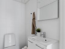 - Pesutilojen varusteet: Suihkuseinä, suihku, pesukoneliitäntä, peilikaappi ja pesuallas. Erillisten WC:n lukumäärä: 1. Erillisen WC:n varusteet: WC-istuin, bidee-suihku, peili, allaskaappi ja pesuallas.