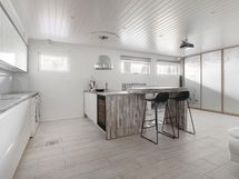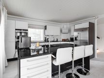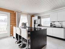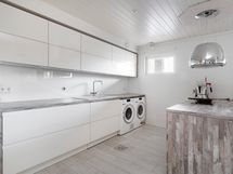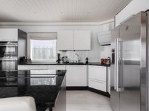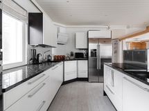 1. krs: Kivitasot, jääkaappi/pakastin, kiertoilmauuni, astianpesukone, mikroaaltouuni, erillisuuni- ja induktioliesi 2kpl, kaapistot, liesituuletin/ aktiivihiilisuodatin, saarekkeessa huippuimuri. Alakerta: Induktioliesi, liesituuletin, viinikaappi ja jääkaappi.