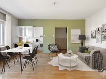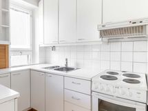 - Keittiön varusteet: Jenkkikaappi, uuni ja liesi. Liesi: Valurautaliesi. Työtason materiaali: Laminaatti.