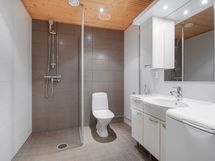 - Kylpyhuone, suihku, suihkuseinä, kylpyhuonekaapisto, pesukoneliitäntä, lattialämmitys