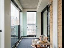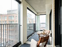 Tilava, koko asunnon levyinen lasitettu parveke pohjoiseen avautuva, tuo lisätilaa asumiseen.