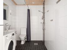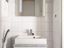 - suihku, peilikaappi, allaskaappi, pesukoneliitäntä, vesikiertoinen lattialämmitys, kiinteät valaisimet. Erillinen wc.
