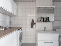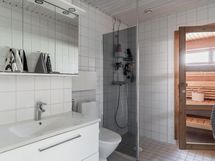 - Sauna, sähkökiuas, erillinen wc, suihku, suihkuseinä, peilikaappi, pesukoneliitäntä.