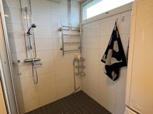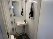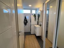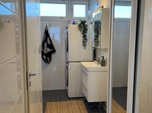 - Suihku, Pesukone, Kuivausrumpu, Peilikaappi, Allaskaappi, Laattalattia, Halogeenivalot, Laattaseinä, Avattava ikkuna, Erillinen WC
