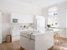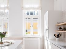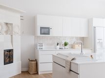 - Massiivitammiparkettilattia (antiikkiveistetty, alustaan liimattu), maalatut seinät. Valkoiset kaapistot. Runsaasti säilytys- ja laskutilaa. Mielen induktioliesitaso ja kalusteisiin asennettu uuni ja mikroaaltouuni. Integroitu Mielen astianpesukone, LG:n side by side -jääkaappi-pakastin (jääpalakone ei toiminnassa). Savon liesituuletin. Viinikaappi (vaatii huoltoa). Saarekkeessa Duravit-posliiniallas. Kivikomposiittitasot. Kiinteä valaistus. Keittiössä kaakeliuuni (ei toimintakunnossa).