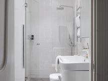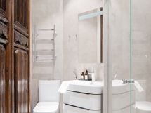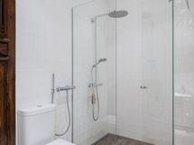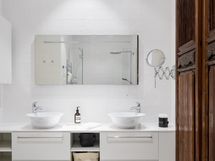 Lattia mikrosementtiä, seinät laattaa. Suihku, suihkuseinä, allas, allashana, allaskaappi, peilikaappi, korkeakaappi, bideesuihku, pyyhepatteri ja wc-istuin. Kiinteä valaistus.