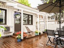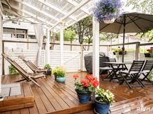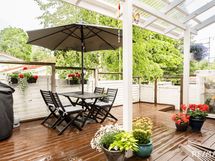 - Koko pihan kattava terassi, jonka ansiosta takapiha on tilavamman oloinen. Kesällä pihalle aurinko paistaa lähes koko päivän. Terassi on rakennettu vuonna 2019.