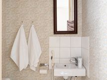 - Varustus: suihkukaappi, pesukoneliitäntä, lattialämmitys, peilikaappi, kiinteät valaisimet. Erillisen WC:n kuvaus: Wc.ssä pieni allas ja hana. . Varustus: bidee-suihku.