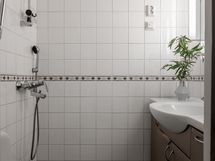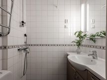 - Kylpyhuone, suihku, peilit, allaskaappi huonokuntoinen, pesukoneliitäntä erillisessä tilassa, lattialämmitys, kiinteät valaisimet.