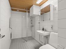 - Pesutilojen varusteet: WC-istuin, suihku, suihkuseinä, pesukoneliitäntä, pesuallas ja peilikaappi.