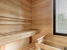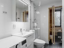 - Saunassa on sähkökiuas. Kylpyhuoneessa on suihku, suihkuseinä, peilikaappi, allaskaappi, pesukoneliitäntä, pyyhekuivain.