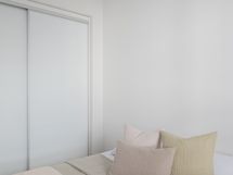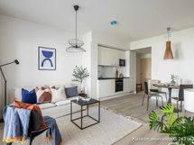 Kodin selkeälinjainen keittiö on varustettu laadukkailla, integroiduilla kodinkoneilla. Tila on avoin olohuoneen kanssa, omat paikkansa löytää niin oleskelualue kuin ruokailutilankin kalusteet. Tyylikkäässä kylpyhuoneessa vallitsee rauhallinen tunnelma, saunan lasiseinä antaa ripauksen luksusta. Säilytystilaa tässä kodissa on eteisen ja makuuhuoneen liukuovikaapistoissa.