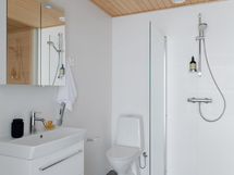 Varustus: suihkuseinä, pesukoneliitäntä, wc-istuin, suihku, peilikaappi.