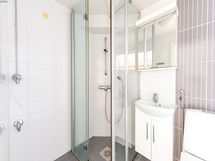 - Varustus: suihkuseinä, pesukoneliitäntä, wc-istuin, suihku, peilikaappi.