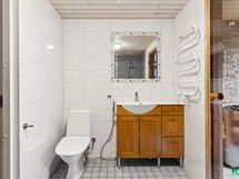 - Kodinhoitotilassa pesukoneliitäntä, pyyhekuivain, pesuallas ja kaapisto, peili, käsisuihku sekä wc. Saunan yhteydessä olevassa kylpyhuoneessa suihku, pesuallas ja käsisuihku sekä pyyhekuivain sekä wc. Iso, ikkunallinen sauna, jossa Helo-sähkökiuas.