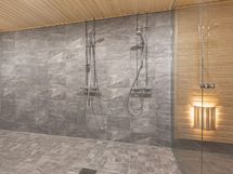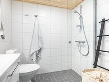 Pesutilojen varusteet: WC-istuin, suihku, suihkuseinä, pesukoneliitäntä, lattialämmitys, peilikaappi, pesuallas ja allaskaappi.