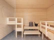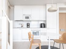 Keittiön varusteet: Jääkaappipakastin, erillisuuni, liesi, mikroaaltouuni, liesituuletin ja astianpesukone. Liesi: Induktioliesi. Työtason materiaali: Laminaatti.