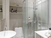 - Pesutilojen varusteet: WC-istuin, suihku, suihkukaappi, pesukoneliitäntä, peilikaappi, pesuallas ja allaskaappi.
