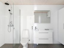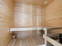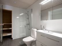 Materiaalivalinnat ovat korkeatasoiset sisältäen Siemensin integroidut kodinkoneet, kivitason, Helon erikoiskiukaan ja sadesuihkun. Päämakuuhuoneesta ja keittiöstä pilkotttaa meri Tullisaarenselän suuntaan.