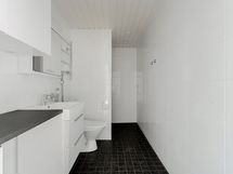 - Pesutilojen varusteet: WC-istuin, suihku, suihkuseinä, pesukoneliitäntä, lattialämmitys, bidee-suihku, pesuallas, peilikaappi, allaskaappi ja kodinhoitonurkkauksena ylä- ja alakaappi, jonka päällä taso.