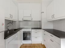- Keittiön varusteet: Jenkkikaappi, liesi, liesituuletin ja astianpesukone. Liesi: Keraaminen liesi. Työtason materiaali: Laminaatti.
