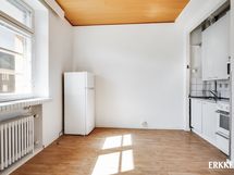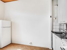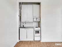 - Toimiva vaaleasävyinen keittiö.Keittiön varusteina mikroaaltouuni, liesi ja jenkkikaappi