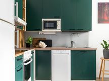 - Liesi: keraaminen. Työtasot: puu, laminaatti. Kylmäsäilytys: jääkaappi/pakastin. Varustus: liesituuletin, mikroaaltouuni, astianpesukone.
