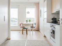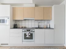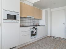 - Jääkaappi pakastelokerolla, erillisuuni, induktioliesi, liesituuletin, mikroaaltouuni, astianpesukone, kaapistot, kiinteät valaisimet.