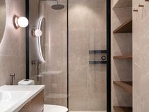 - 2 kylpyhuonetta: 2 sadesuihku, suihkuseinät, altaat ja allaskaapit, 2 wc istuinta, bidee suihku, taustavalaistut peilit, kiinteät valaisimet, epäsuora valaistus pesuainetelineet ja naulakot, pyykinpesukoneliitännät