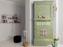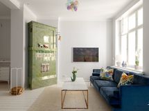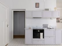 Asunnon pohja tarjoaa monipuolisia ratkaisuja moneen tarpeeseen. Asunnon sydän on valoisa avokeittiö-olohuone, jossa katseenvangitsijana toimii kaunis vihreä kakluuni. Keittiö on remontoitu tyylikkääksi, ja varusteltu laadukkailla kodinkoneilla.