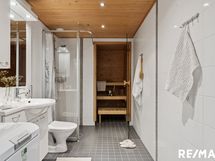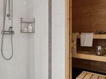 - Pesutilojen varusteet: WC-istuin, suihku, peilikaappi, pesuallas, allaskaappi, lattialämmitys, bidee-suihku, pesukoneliitäntä ja suihkuseinä.