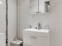 Pesutilojen varusteet: WC-istuin, suihku, peilikaappi, pesuallas, allaskaappi ja bidee-suihku.