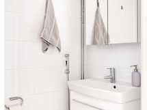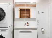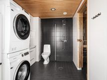 - Suihku, suihkuseinä, peilikaappi, allaskaappi, pesukoneliitäntä, sähköinen lattialämmitys, wc-istuin, saunassa sähkökiuas, kiinteät valaisimet. Lisäksi erillinen wc, jossa peilikaappi, allaskaappi ja sähköinen lattialämmitys.