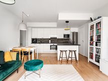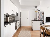 - Puustellin kaapistot, jääkaappipakastin, induktioliesitaso, erillisuuni, liesituuletin, mikroaaltouuni, astianpesukone, kiinteät valaisimet.