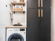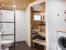 - Suihku, Suihkuseinä, Pesukonevalmius, Peilikaappi, Allaskaappi, Laattalattia, Laattaseinä, Avattava ikkuna, Lattialämmitys