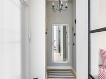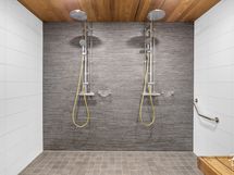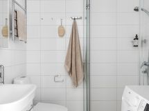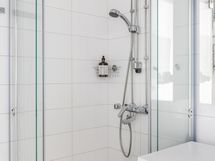- Pesutilojen kuvaus: Linjasaneerauksen yhteydessä uusitussa kylpyhuoneessa on peilikaappi valaisimella, allas ja allaskaluste, pyyhekuivain, wc-istuin, suihku, taittuvat suihkuseinät, peilikaappi, pyykinpesukone ja lattialämmitys, Seinät ja lattia laattaa. .