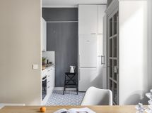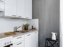 - Keittiössä valkoiset kaapistot, jääkaappi-pakastin, keraaminen liesi, uuni, astianpesukone ja laminaattityötaso. Lattia poltettua laattaa.