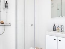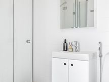 - Pesutilojen kuvaus: Kylpyhuone on uusittu putkiremontin yhteydessä 2018, ja se yhdistää modernit mukavuudet, kuten lattialämmityksen, sekä tyylikkään ja toimivan tilaratkaisun. Kylpyhuoneessa on erinomaisesti hyödynnetty tilaa, ja se tarjoaa paikan pyykinpesukoneelle ja kuivausrummulle, jotka voidaan asentaa kätevästi päällekkäin, säilyttäen avaruuden ja käytännöllisyyden. Varustus: suihkukaappi, pesukoneliitäntä, lattialämmitys, wc-istuin, suihku, peilikaappi.