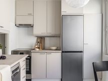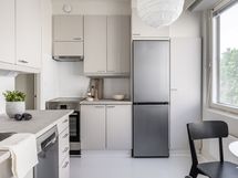 - Liesi: induktio. Työtasot: laminaatti. Kylmäsäilytys: jääkaappi/pakastin. Varustus: liesituuletin, astianpesukone, kiinteät valaisimet. Keittiö on juuri valmistunut perusteellisesta remontista, jossa pinnat, kodinkoneet ja toiminnot on uusittu moderniksi ja toimivaksi kokonaisuudeksi. Uudet, energiatehokkaat kodinkoneet, kuten Bosch astianpesukone (Silence Plus, Home Connect) ja Electrolux induktioliesi (A-energialuokka, kuivaus- ja höyrytoiminto), tuovat nykyaikaisia toimintoja ja lisäävät keittiön käytännöllisyyttä. Työtasot on uusittu kestävällä materiaalilla, ja keittiöön on asennettu myös tyylikäs Mora design-hana ja allas, jotka täydentävät tyylikkään ja ajattoman kokonaisuuden.