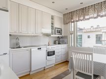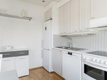 - Jääkaappipakastin, keraaminen liesi, liesikupu, astianpesukone, kaapistot, kiinteät valaisimet.