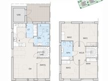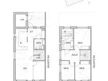 Kodin alakerrasta löytyy eteistilat, yhtenäinen olohuone ja keittiö sekä pesuhuone ja sauna. Alakerran oleskelutiloissa on reilu, 2,8 metrin huonekorkeus. Olohuoneesta on lisätyönä jaettavissa yksi lisähuone, tai voit sen toteuttaa tulevaisuudessakin. Portaan alapuolella on käytännöllinen varasto. Yläkerrassa on 4 makuuhuonetta sekä yhdistetty kodinhoito- ja pesuhuone, jossa on wc ja suihku.