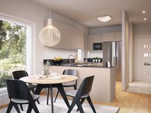 - Keittiö, ruokailutila ja olohuone luovat tilavan, viihtyisän kokonaisuuden