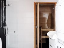 - Kylpyhuone, sähkösauna, peilikaappi, pesukoneliitäntä, lattialämmitys, erillinen wc.
