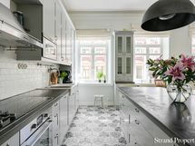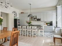 Keittiö on kauniisti remontoitu puusepän kalusteilla ja sieltä löytyvät modernit kodinkoneet ja iso saareke. Sinne mahtuu myös suuri ruokapöytä. Isot ikkunat tuovat paljon valoa keittiöön.