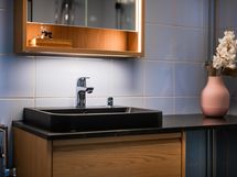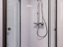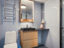 - Suihkuseinä, Suihku, Pesukonevalmius, Peilikaappi, Allaskaappi, Rättipatteri, Laattalattia, Laattaseinä, Lattialämmitys