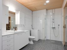 - Suihku, Pesukoneliitäntä, Mukavuuslattialämmitys, Tilaa pesukoneelle, Käsisuihku, Kaapisto, Allas, WC-istuin, Peili, Suihkukaappi