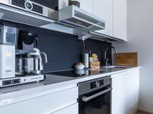 Liesi: integroitu, muu. Kylmäsäilytys: jääkaappi/pakastin. Varustus: liesituuletin, mikroaaltouuni, astianpesukone.