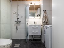 Varustus: suihkuseinä, pesukoneliitäntä, wc-istuin, suihku, peilikaappi.